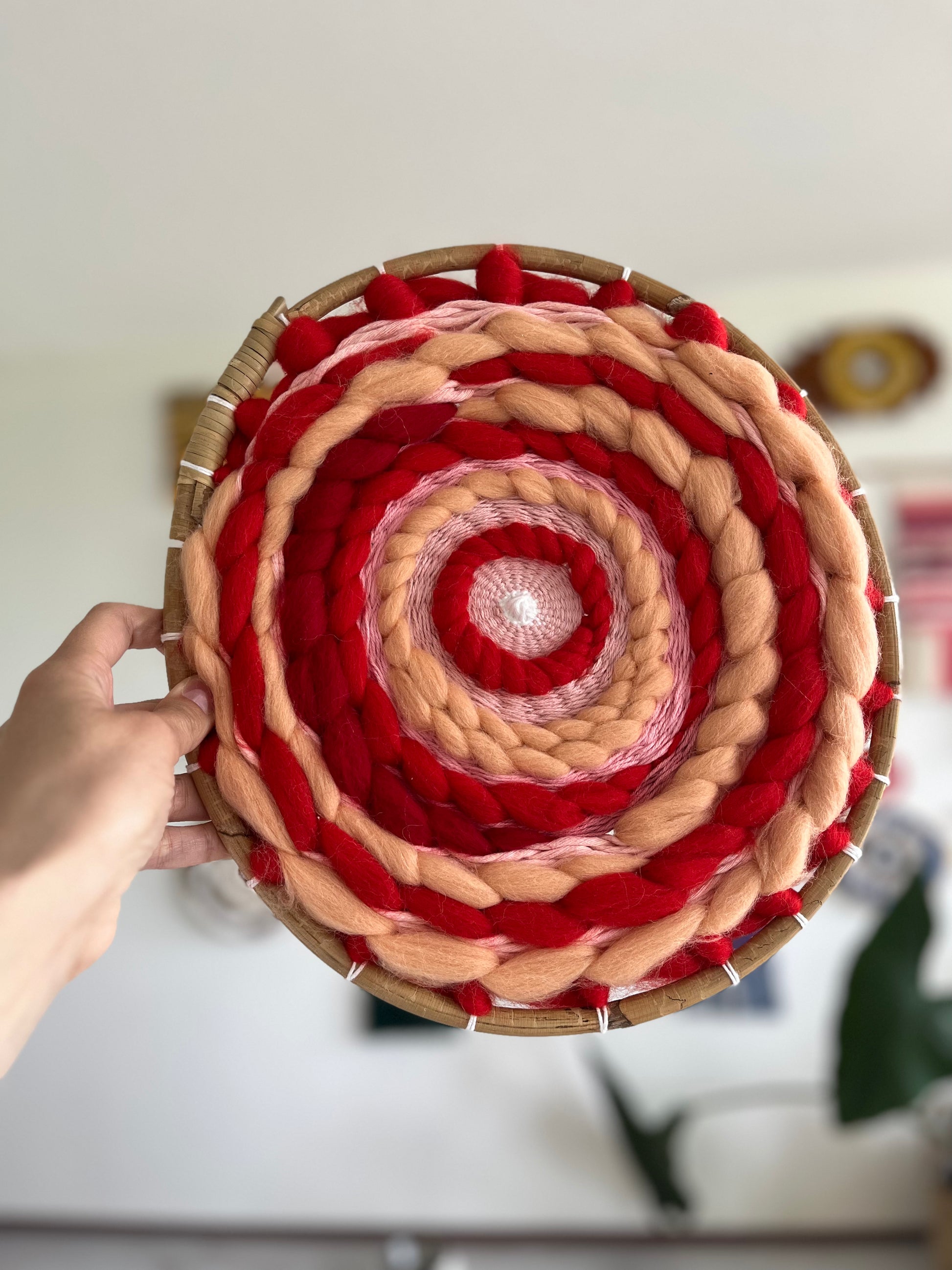 This beautiful hand-made circular weaving is a perfect finishing touch for any room. Crafted from a blend of peachy and red hues, this eye-catching piece will bring contemporary sophistication to any setting. The circular design is unique and modern, offering an interesting visual experience.