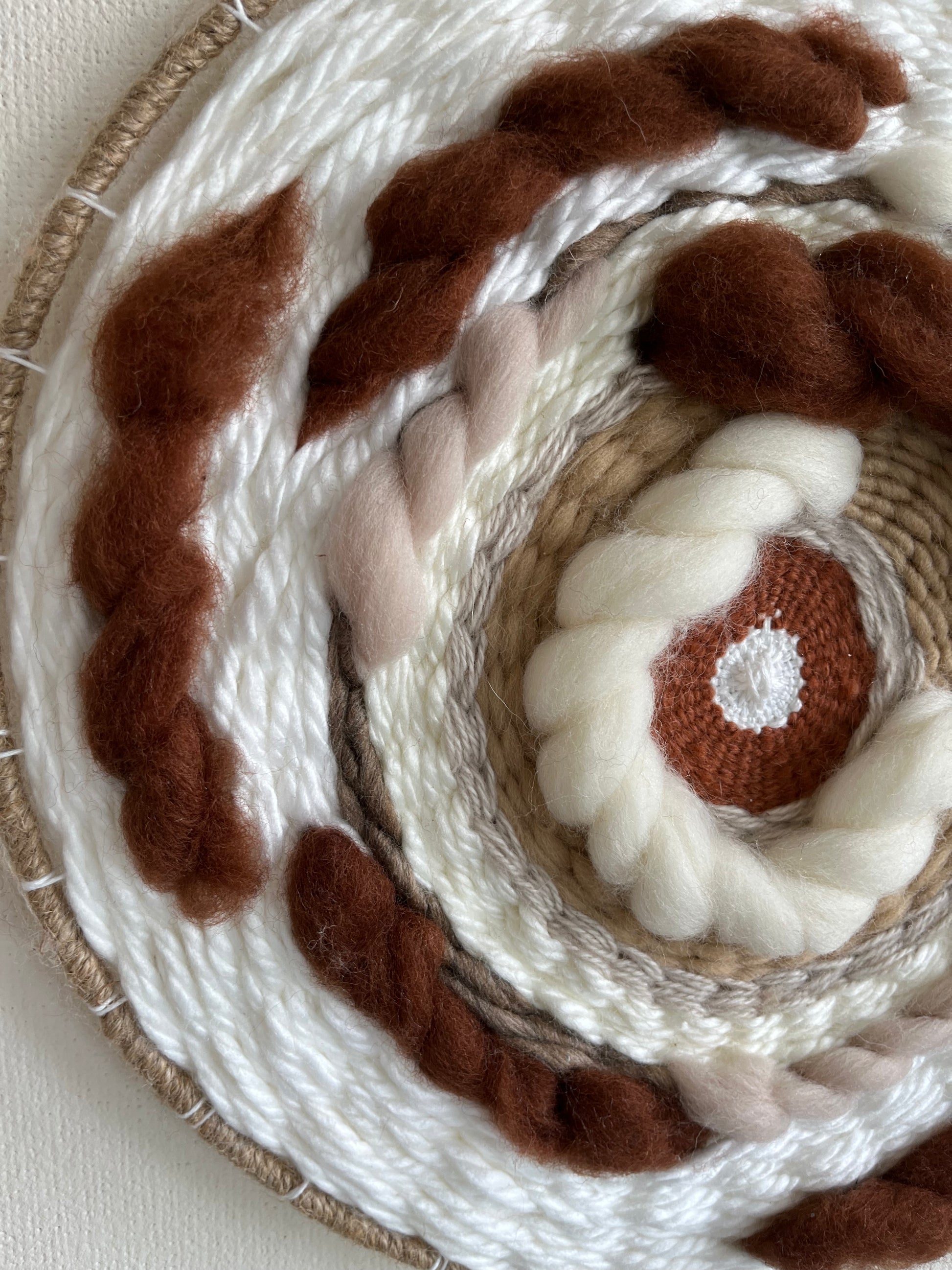 This circular weaving evokes artistry and elegance, with its harmonious blend of brown and white. Handcrafted with care, the intricate weaving is a statement piece that will add sophistication to any living space.